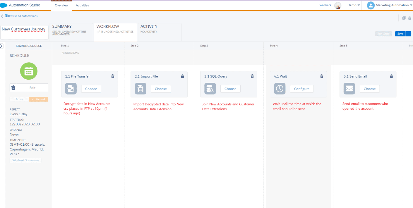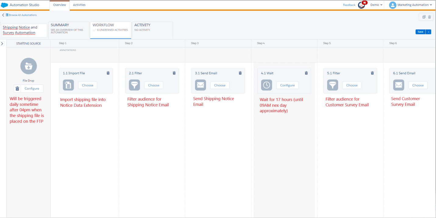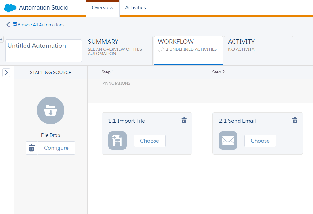 In any case, whether it’s the 15th day or a Friday, the email must be sent after processing the import. Therefore, an automation triggered by a File Drop is required, which will have an Import File Activity to a Data Extension or List, followed by a Send Email Activity to send the email.