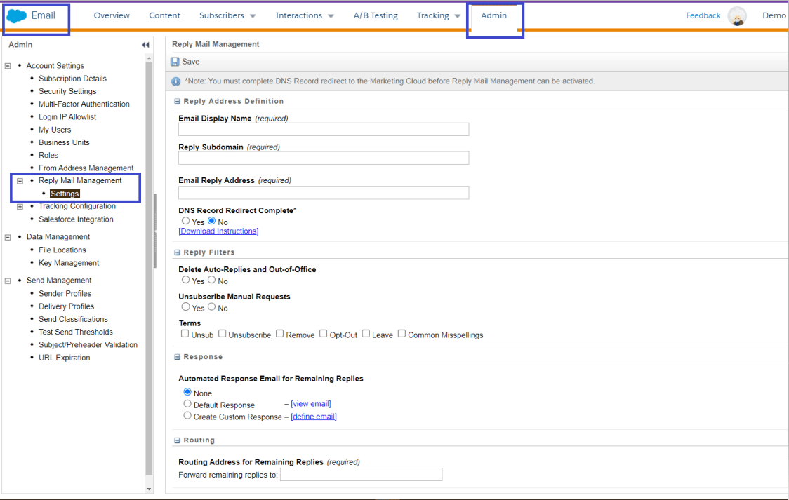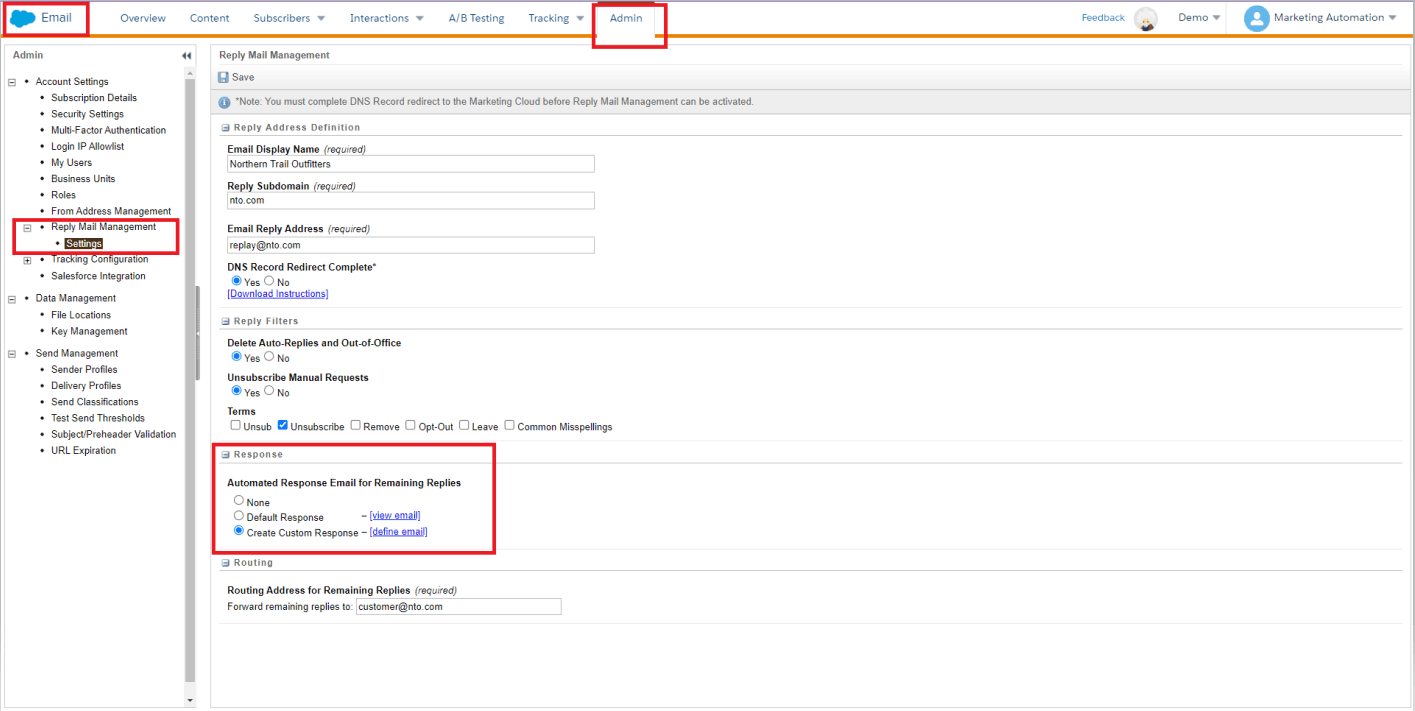 Northem Trail Outfitters (NTO) sends emails from Content Builder and Journey Builder. When subscribers reply to an email, NTO would like to send an auto-reply message using a pre-defined HTML email that explains email replies are unmonitored and they should call NTO for any inquiries. How could these auto-reply messages be enabled?