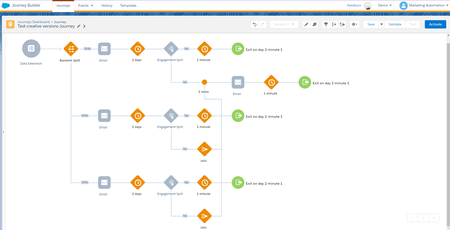 We evaluate the interaction (Engagement Split), merge all those who have interacted into a single branch (Join), and send the second email (Send email).
