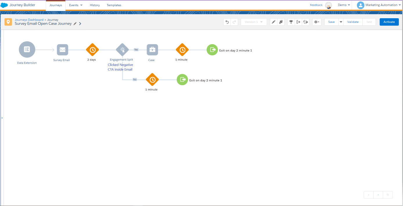 A Journey sending, for example, an email with two different CTAs for positive/negative response, followed by a Wait Activity, and after that, an Engagement Split that evaluates whether the contact has clicked on the negative response CTA, adding a Case Creation Activity in the YES branch of the split to create a case in Salesforce.