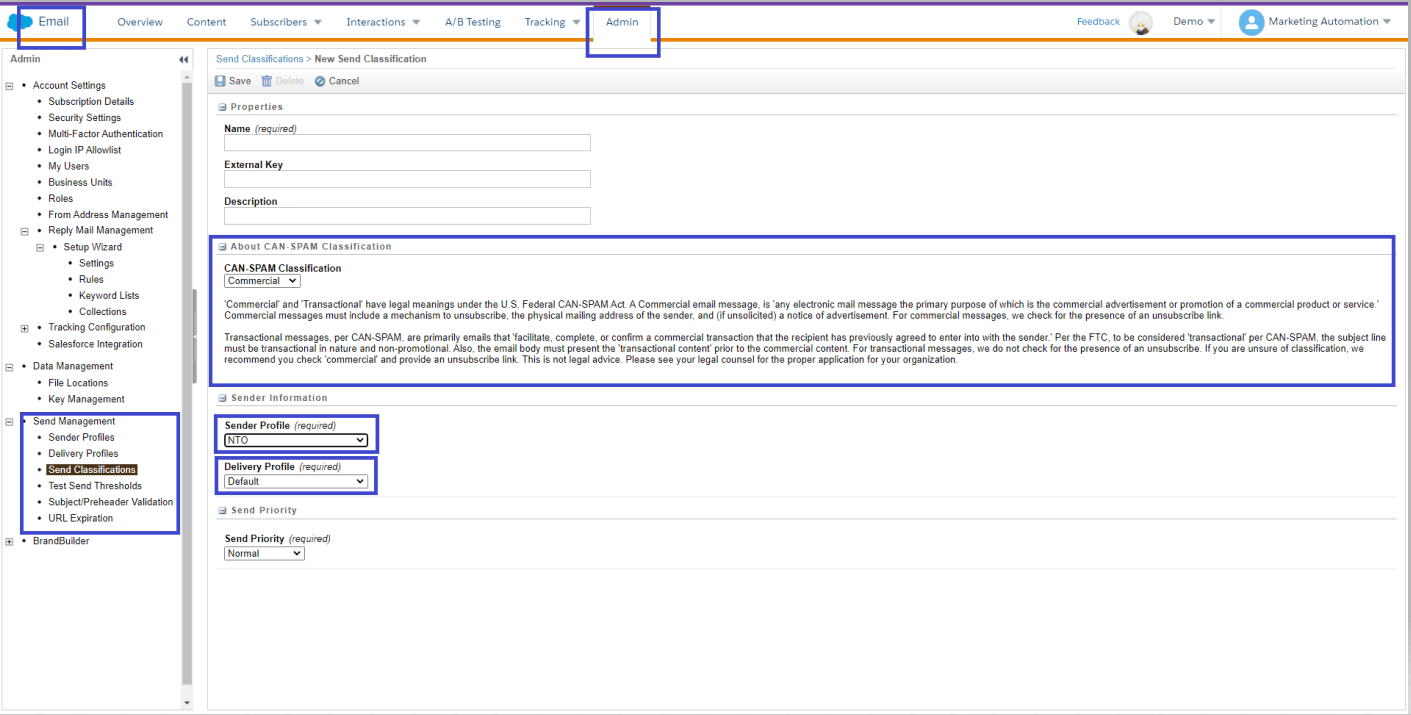 We need to determine how we will display the From Name for both regions (USA and Canada) and which Send Classification (commercial or transactional) should be used for the sends.