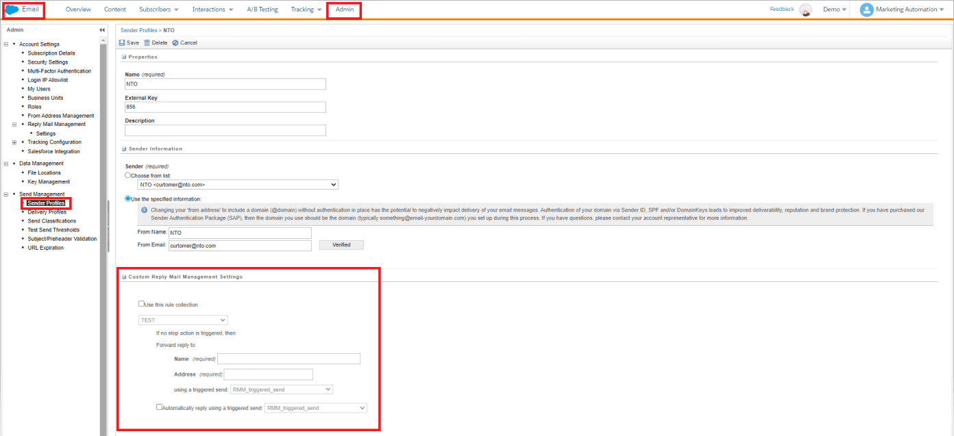 The auto-reply messages that we can configure within the Reply Mail Management settings in the custom message section are simple texts. If we want to use HTML, we will need to have a pre-created Triggered Send with the desired email. Then, in the configuration of a Sender Profile, we will set up the “Custom Reply Mail Management Settings” section to use the Triggered Send we have created.