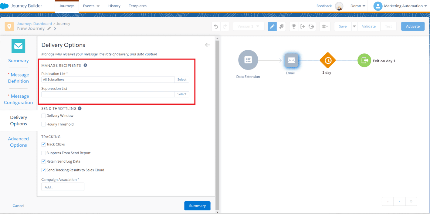 Within the delivery options of an email activity within a Journey, we can manage the recipients of the message using Publication Lists and Suppression Lists.