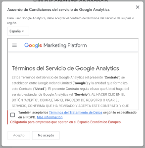 - Una vez iniciado el proceso seguiremos las instrucciones de guía: dar nombre a la propiedad, elegir el flujo de medición web, indicar el dominio web al que corresponden los datos y, muy importante, seleccionar el país en el que se encuentra radicada nuestra empresa. Este paso es especialmente importante para países del Espacio Económico Europeo, ya que se encuentran bajo la legislación especial de protección de datos (que en España se conoce como RGPD)