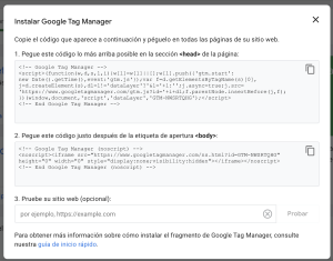 Este es el código que necesitaremos presente en nuestra web: bien porque un desarrollador (o nosotros mismos si contamos con los conocimientos) lo incluye en el head y en el body, o bien porque hemos creado la web desde una plataforma estandarizada como Shopify o WordPress y podemos utilizar integraciones directas o plugins de terceros para incluirlos.