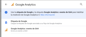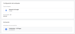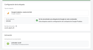 Juntando todos los elementos podremos configurar nuestra etiqueta de evento forma completa. En la de configuración ya viene pre rellenada por GTM y solo tendremos que indicar el ID de medición: