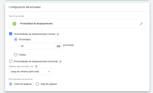 - Los activadores definen qué circunstancias deben suceder para realizar el envío. En nuestro caso utilizaremos el activador personalizado de tipo scroll y marcaremos que se ejecute cada vez que alguien supere el 85% del contenido en un desplazamiento vertical. Es un caso habitual por ejemplo en estudios de CRO y calidad de contenido.