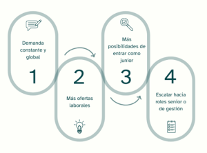 Este módulo mantiene una demanda constante y global por lo que nos ofrece más ofertas laborales, estabilidad profesional, más posibilidades de entrar como junior y poder ir escalando hacia roles senior o de gestión.